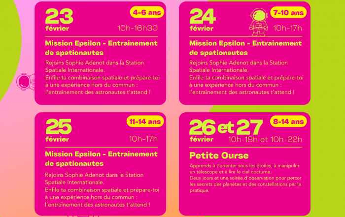 L'Espace des Sciences et de Découverte organise lors des vacances d'hiver de la Zone C plusieurs stages consacrés à l'Espace, l'Astronomie et à la Robotique ! De l'immersion dans l'entraînement d'un·e astronaute , à [...]